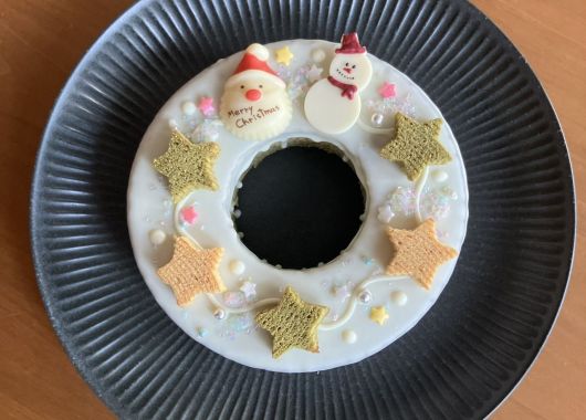 ホールバウムクーヘンにクリスマスリースのようにデコレーションして、